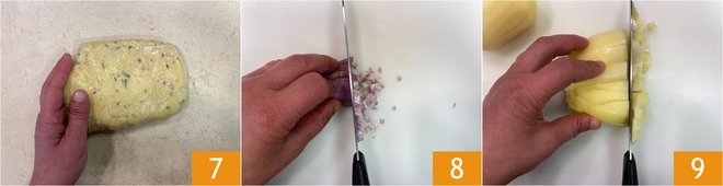 Cuando la masa esté lista, envuélvela con film transparente 7 y guárdala en el frigorífico durante unos 30 minutos: este paso permitirá que la masa se endurezca y será más fácil estirarla después. Mientras tanto, comienza a preparar la crema: pica finamente una chalota 8, luego pela las patatas y córtalas en cubos 9.