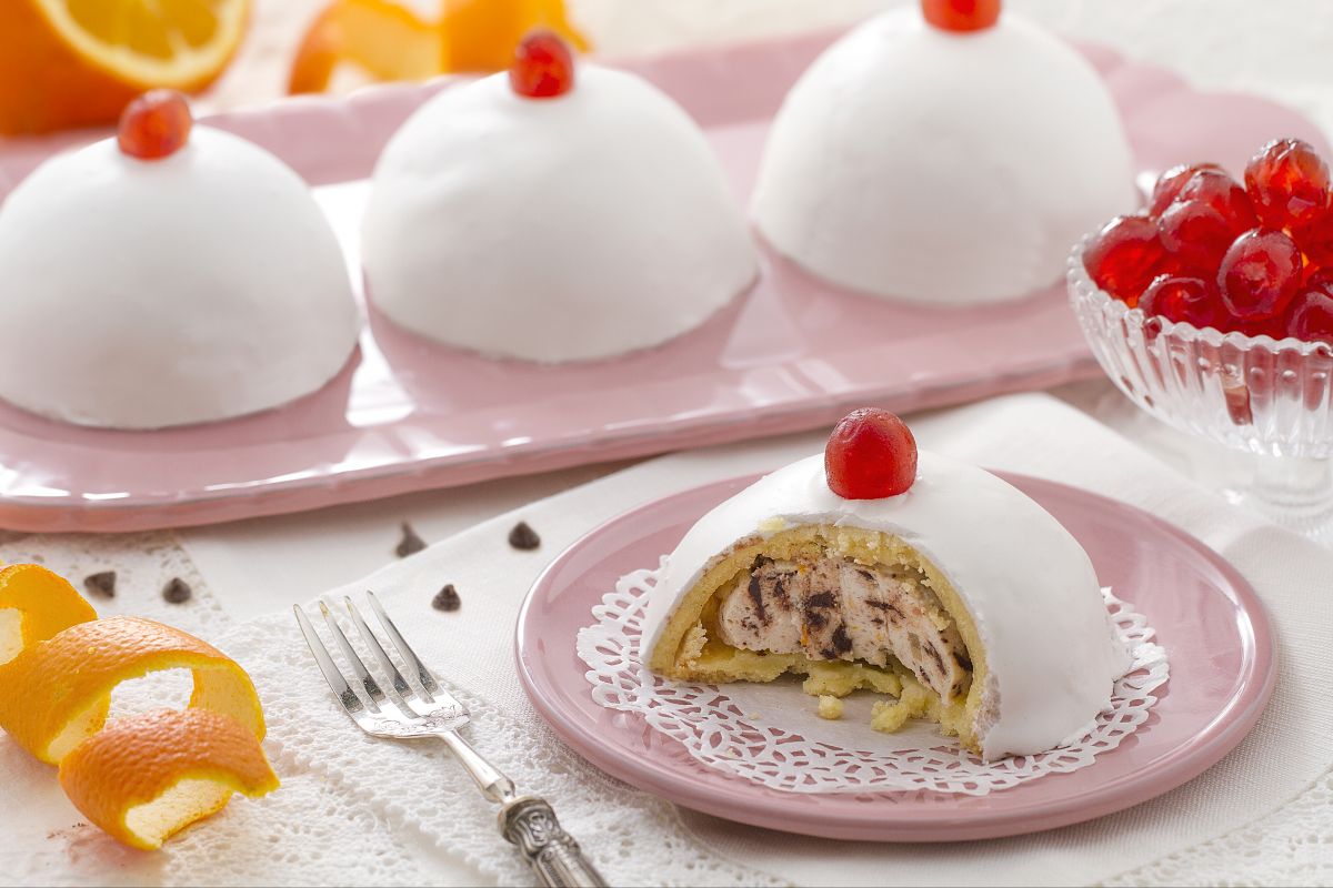Una vez cocidas, las cassatinas se cubren con un glaseado blanco y se decoran en la parte superior con una cereza confitada.