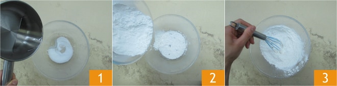 Para preparar los mochi, primero calienta el agua en un cazo y viértela hirviendo sobre el azúcar 1. Añade la harina de arroz 2 y mezcla con un batidor 3.