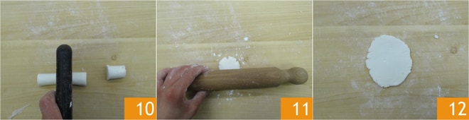Obtén unos trocitos 10. Extiende la masa con un rodillo 11 para crear unos pequeños discos 12.