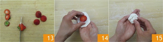 Lava y seca las fresas, luego quítales el pedúnculo 13. Envuelve la fresa con el disco de masa 14 y cierra el extremo 15.