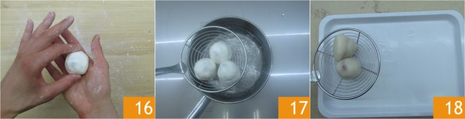 Debes obtener una especie de conito que recuerde la forma de la fresa 16. Hierve los Mochi 17 durante unos minutos hasta que suban a la superficie 18.