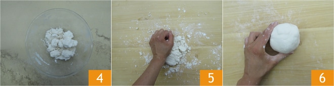 Una vez recogidos los ingredientes 4, transfiere la masa sobre una superficie de trabajo y amasa 5 hasta formar una bola homogénea 6.