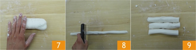 Recupera la bola y extiéndela 7 para formar unos cilindros, córtalos en piezas más pequeñas 8 9.