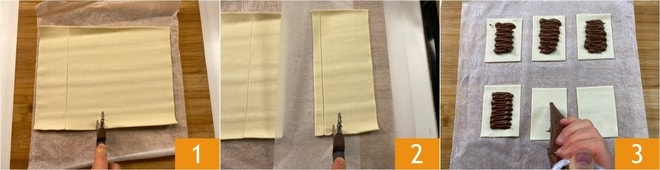 Para preparar las momias de Nutella y plátano, primero desenrolla el hojaldre rectangular sobre una superficie de trabajo. Ahora corta 6 rectángulos grandes de 10x5 cm 1 y con el hojaldre restante corta tiras de aproximadamente 1 cm de grosor 2. Ayudándote con una manga pastelera coloca la Nutella sobre los rectángulos, dejando un borde libre 3.
