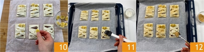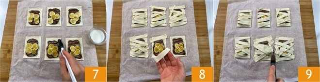 Pincela los bordes con un poco de leche 7 y cubre con varias tiras formando momias 8. Recorta los bordes si las tiras sobresalen demasiado 9.
