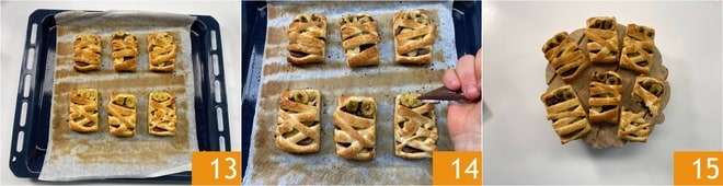 Hornea en horno estático precalentado a 200° durante unos 20 minutos. Cuando estén bien doradas, sácalas del horno 13 y déjalas enfriar unos minutos antes de hacer los ojitos. Para hacerlo, simplemente exprime un puntito de Nutella sobre los plátanos 14 y coloca una gota de chocolate encima. Continúa así con todas y tus momias estarán listas 15!