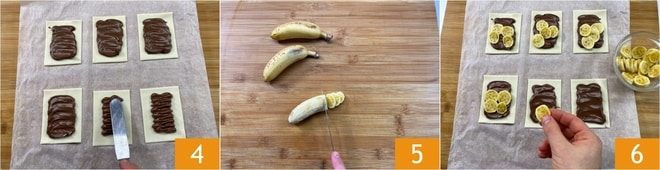 Extiende la Nutella con una espátula para uniformarla 4, luego pela los plátanos y córtalos en rodajas finas 5. Coloca sobre la Nutella 3-4 rodajas de plátano dejando una franja superior libre 6.