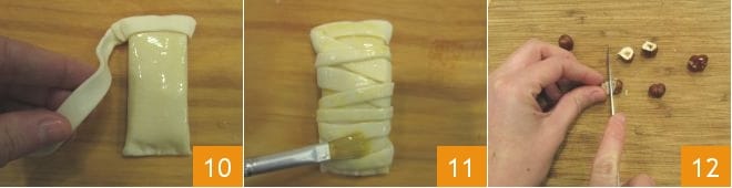 y enróllala bien apretada en la parte superior 10. Justo debajo de esta primera vuelta, crea una hendidura para dejar espacio a los ojitos de la momia y sigue envolviendo el paquetito de manera cruzada o en sentido horizontal, superponiendo ligeramente las tiras para obtener un efecto más realista. Finalmente pinta nuevamente con la yema 11. Corta por la mitad, a lo largo de la costilla, las avellanas peladas 12.