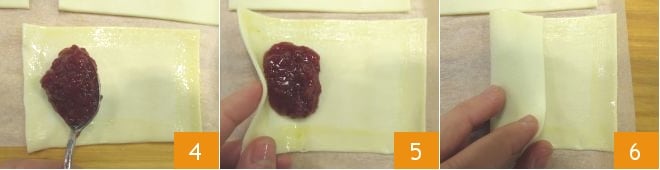 Manteniéndote un poco hacia la parte izquierda del lado largo, coloca una cucharadita abundante de mermelada sobre el hojaldre 4. Luego toma el borde izquierdo, levántalo suavemente 5 y colócalo sobre la mermelada 6.