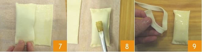 Sella los bordes presionando con los dedos 7 y dobla el paquetito sobre el borde restante de hojaldre. Vuelve a sellar los bordes de la misma manera, luego pinta con huevo la superficie del rollito obtenido 8. Ahora toma una tirita de hojaldre 9