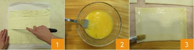 Para preparar las momias dulces de hojaldre con frambuesas, lo primero que hay que hacer es cortar 6 rectángulos de 10x11 cm de la masa de hojaldre, luego cortar tiras finas del hojaldre restante 1. Pincha el hojaldre con los dientes de un tenedor. Bate ligeramente la yema de huevo en un bol pequeño 2 y moja en ella un pincel. Luego pinta el perímetro de un rectángulo de hojaldre 3.
