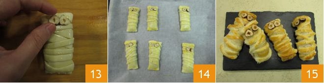 Coloca después en la hendidura entre las vendas dos mitades de avellana, a modo de ojos, ejerciendo una ligera presión para hundirlas en el hojaldre 13. Continúa así hasta obtener 6 pequeñas momias. Colócalas sobre una bandeja de horno cubierta con papel de horno 14 e introdúcelas en el horno estático precalentado a 180° durante 25 minutos, hasta que estén doradas. No te preocupes si durante la cocción se sale un poco de mermelada: ¡el efecto será aún más realista y espeluznante! ¡Tus momias dulces de hojaldre con frambuesas están listas para ser degustadas 15!
