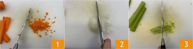 Para preparar los moscardini en guazzetto, lo primero que hay que hacer es asegurarse de que los moscardini estén ya limpios; enjuágalos bajo el agua y déjalos en un escurridor. Pela las zanahorias y pícalas finamente 1. Pela la cebolla y pícala también 2, luego pela el apio y pícalo del mismo tamaño que las zanahorias y las cebollas 3.