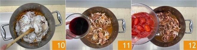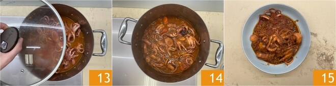 Tapar 13 y cocinar durante 45-60 minutos, añadiendo un poco de agua, preferiblemente caliente si es necesario. Los moscardini deben quedar muy tiernos y la salsa debe estar lo suficientemente espesa 14. En este punto, podrás servirlos 15.