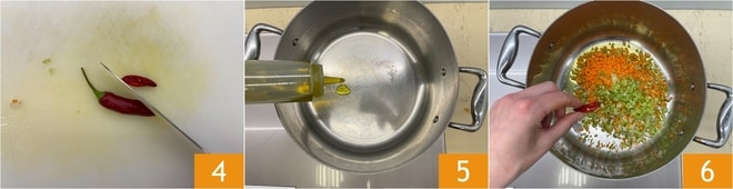 Corta también un trozo de guindilla 4, servirá también para el sofrito. En una cazuela grande, añade el aceite 5, el sofrito y la guindilla 6.