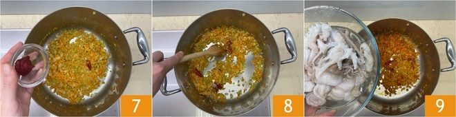 Deja que se impregne bien, cocinando a fuego alto. Tan pronto como empiece a freír, añade una pizca de sal. De esta manera, las verduras liberarán su líquido y el sofrito no se quemará. Después de unos 5 minutos, añade el concentrado de tomate 7 y mezcla 8. Tóstalo durante un par de minutos y luego añade los moscardini 9.