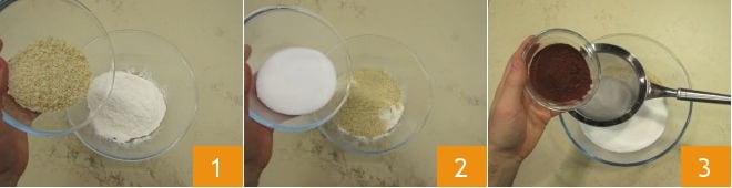 Para preparar los mostaccioli napolitanos comiencen vertiendo en un recipiente la harina, el granillo de almendra 1 y el azúcar 2. Luego tamicen el cacao amargo en polvo 3,