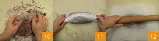 Trabájenla a mano hasta que todos los ingredientes estén bien amalgamados 10. Envuelvan el bloque en papel de horno y dejen reposar en el frigorífico durante al menos una hora 11. Transcurrido el tiempo, extiendan la masa con el rodillo entre dos hojas de papel de horno 12