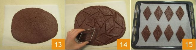 y obtengan una superficie con un grosor de unos 7-8 mm 13. De esta corten aproximadamente 20 rombos cuyos lados midan 7 cm 14. A medida que obtengan las formas, trasládenlas a una bandeja con papel de horno, espaciándolas entre sí 15.