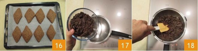 Coloquen 8 rombos a la vez en la bandeja y procedan con los diferentes horneados: cuezan en horno caliente a 180° durante unos 18 minutos 16. Una vez cocidos, déjenlos enfriar completamente sobre una rejilla antes de glasearlos. Piquen groseramente el chocolate negro 17 y déjenlo derretir al baño maría mientras revuelven para que no se queme 18.