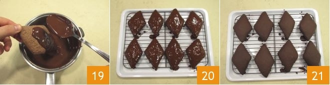 Si lo prefieren, pueden sumergir los mostaccioli directamente en el chocolate derretido y luego dejarlos solidificar sobre el papel de horno. De lo contrario, para un resultado aún más bonito de ver, pueden cubrir primero una parte sosteniendo las galletas por la punta y cubriéndolas de chocolate con la ayuda de una cuchara 19. Coloquen sobre una rejilla, con un papel de horno debajo 20, y dejen secar en un lugar fresco hasta que el chocolate se haya solidificado completamente 21.