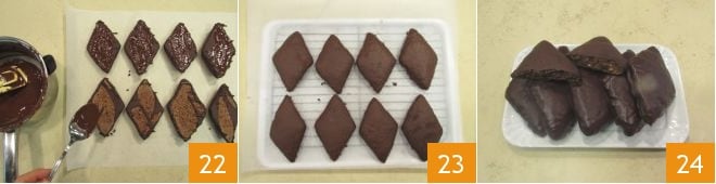 Después, giren los mostaccioli sobre un papel de horno y colóquenlos sobre la rejilla. Vuelvan a derretir el chocolate y cubran también la otra parte 22. Dejen que el chocolate se solidifique de nuevo en un lugar fresco 23. ¡Aquí están listos sus mostaccioli napolitanos, solo queda disfrutarlos 24!