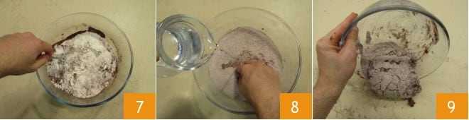 y mezclen bien todo 7. Añadan el agua a temperatura ambiente en un hilo teniendo cuidado con la cantidad necesaria: la masa podría necesitar una cantidad ligeramente inferior o superior. Mientras vierten el agua, amasen con la otra mano 8. Tan pronto como obtengan una mezcla homogénea podrán trasladarla a la mesa de trabajo 9.
