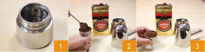 Para realizar la mousse de café en taza con cantucci, comienza preparando el café con la moka: pon el agua fría, preferiblemente baja en cal, dentro de la caldera hasta que llegue a la válvula de seguridad 1 (de lo contrario obtendrás un café más largo). Llena el filtro con el café molido 2 y nivélalo con cada cucharadita de café agregada golpeando el filtro sobre la mesa con movimientos decididos 3, hasta alcanzar el borde del filtro.