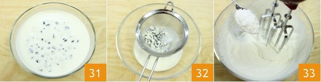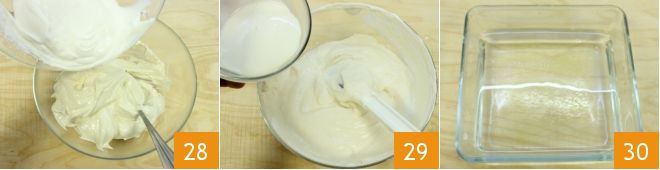 e incorpórala al merengue delicadamente 28. Añade la mezcla de nata y gelatina 29 y deja que la mousse se endurezca en el frigorífico durante al menos 2 horas. La mousse oscura está lista, ahora dedícate a la clara: pon la gelatina a ablandar en agua fría 30,