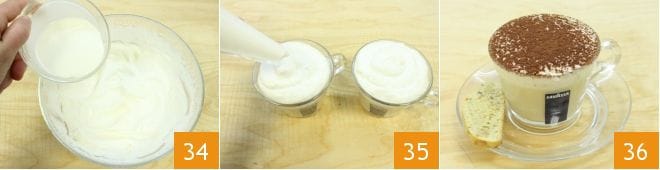 Une la gelatina disuelta a la mousse 34 y deja que la mousse se endurezca en el frigorífico durante al menos 2 horas. Transcurrido este tiempo puedes componer el postre: toma unos vasitos y vierte ¾ de mousse oscura con una manga pastelera, luego completa la superficie con la mousse clara 35. Termina espolvoreando con cacao amargo 36. Sirve la mousse de café en taza acompañándola con los cantucci de avellanas.
