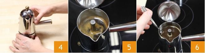 No presiones con la cucharita, ni hagas agujeros y ajusta bien la cafetera 4 (para evitar que el café se derrame por los lados mientras sube), luego ponla a una llama baja y constante, para obtener un café con cuerpo. A medida que el café sube, se formará una espuma densa 5; recomendamos no dejar burbujear el café demasiado tiempo, para mantener intactos el aroma y la dulzura. Luego apaga el fuego y tu café para usar en la preparación está listo: mézclalo directamente en la moka con una cucharita, para hacerlo más homogéneo 6.