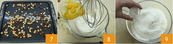 Ahora ocupaos de la preparación de los cantucci: primero enciende el horno a 190° y cuando haya alcanzado la temperatura tuesta las avellanas bien dispuestas en una bandeja 7 durante 3-4 minutos; luego sácalas del horno y déjalas enfriar. Luego procede a formar la masa para los cantucci: coloca los 4 huevos enteros y una yema en la batidora 8 (o en un bol amplio) y añade la pizca de sal y el azúcar granulada. Aparte tamiza las harinas y añade la levadura 9