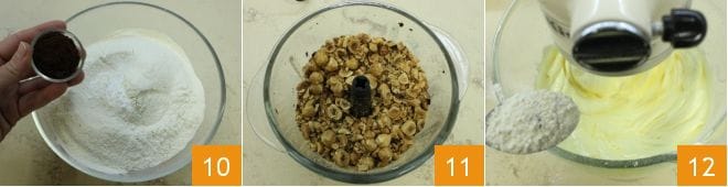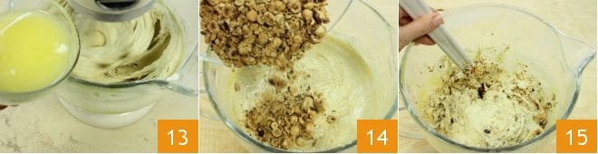 Añade ahora la mantequilla derretida 13, las avellanas 14 y mezcla para obtener una masa desmenuzada y suave 15.