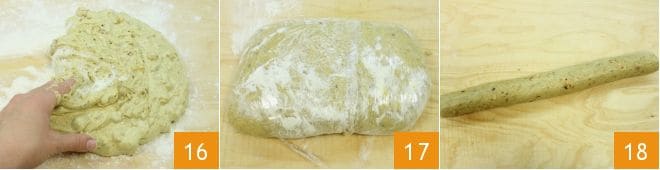 Transfiere la masa a una superficie enharinada 16 y compacta a mano hasta obtener una bola uniforme. Cubre el bloque con plástico 17 y colócalo en el frigorífico para que repose durante al menos media hora. Transcurrido este tiempo, retoma la masa, forma 3 cilindros de unos 30 cm de largo 18;