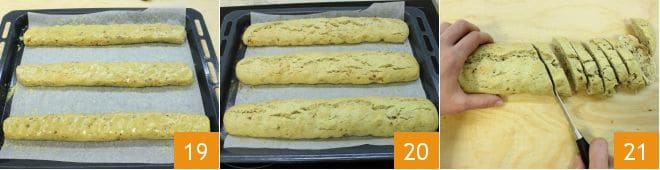 coloca los cilindros en una bandeja de horno cubierta con papel de horno, úntalos con el huevo entero 19 ligeramente batido y hornea durante 20 minutos en el horno precalentado a 190°. Transcurrido este tiempo, saca los cilindros 20, déjalos enfriar unos minutos y procede a cortarlos en diagonal 21 para obtener galletas (cantucci) de aproximadamente 1-1,5 cm.