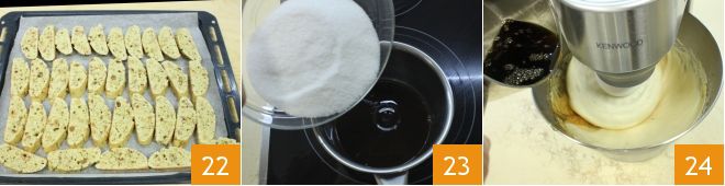 Coloca las galletas obtenidas nuevamente en la bandeja y déjalas "biscotear" en el horno a 170° durante unos 10-15 minutos 22. Ahora puedes dedicarte a la mousse oscura preparando el merengue de café: Coloca en un cazo de fondo grueso 30 ml de café y 75 g de azúcar granulada 23, calienta la mezcla a fuego bajo y mezcla para disolver el azúcar; en cuanto el jarabe comience a hervir, sumerge el termómetro de cocina, que te indicará la temperatura, cuando el jarabe haya alcanzado los 116°. Comienza a batir las claras a punto de nieve a velocidad media con una batidora equipada con varillas y en cuanto se pongan blancas añade 50 g de azúcar. Las claras deben estar bien montadas cuando el jarabe llegue a 121°C. Cuando el jarabe haya alcanzado la temperatura indicada, viértelo en hilo sobre las claras 24,