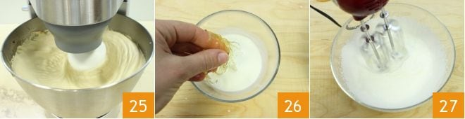 continuando a batir con las varillas hasta el completo enfriamiento del merengue 25. Pon la gelatina en remojo en agua fría para ablandarla y luego disuélvela en 50 ml de nata tibia 26. Aparte monta 150 ml de nata con una batidora eléctrica 27 siguiendo la ficha cómo montar la nata.