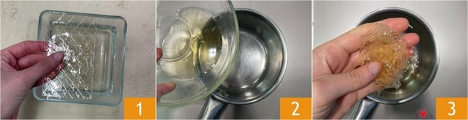 Para realizar la mousse de higos y frutos secos, lo primero que debes hacer es poner las hojas de gelatina en remojo en agua fría 1. Vierte el ron en un cazo y caliéntalo suavemente 2, luego añade las hojas de gelatina bien escurridas 3.