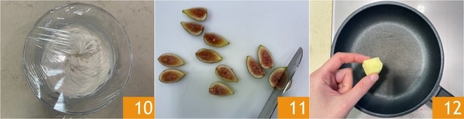 Cubre el bol con film y deja que se endurezca en la nevera durante 30 minutos 10. Mientras tanto, corta los higos en 4 gajos, sin pelarlos 11. Derrite la mantequilla en una sartén antiadherente 12.