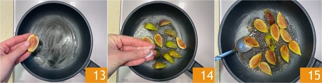 Coloca los higos en la sartén 13, luego añade el azúcar 14 y dora a fuego medio-alto durante unos minutos, para que tomen color 15.