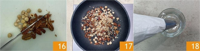 Finalmente, pica groseramente las nueces pecanas y las avellanas 16, luego tuéstalas brevemente en la sartén 17. Estás listo para ensamblar el postre: llena 2 vasitos con capacidad de 200 ml con la mousse que habrás transferido a una manga pastelera con boquilla de estrella de 8 mm 18.