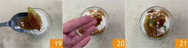 Decora los vasitos con los higos 19 y los frutos secos 20, luego completa con las hojitas de mejorana. ¡Tu mousse con higos y frutos secos está lista para ser servida 21!