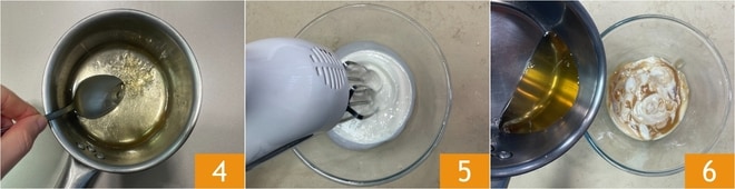 Remueve con una cucharita para disolver completamente la gelatina 4 y deja que se temple. Mientras tanto, semimonta la nata con las varillas eléctricas 5. Vierte el yogur de caramelo en un bol, luego añade el ron templado con la gelatina 6.