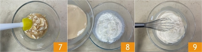 Mezcla para combinar la mezcla 7, luego agrega la nata semimontada 8 e incorpórala con una varilla manual 9.