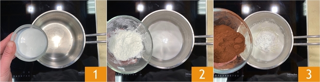 Para preparar la mousse de menta y cacao, verted la leche de coco en un cazo 1, añadid el almidón de maíz 2 y el cacao puro 3.