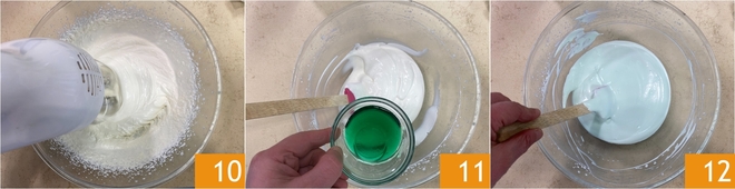 Debéis obtener una consistencia firme y estable 10. Verted el sirope de menta en la nata 11 y mezclad con delicadeza con una espátula, con movimientos de abajo hacia arriba, para no bajar la mezcla y mantener una textura suave y aireada 12.