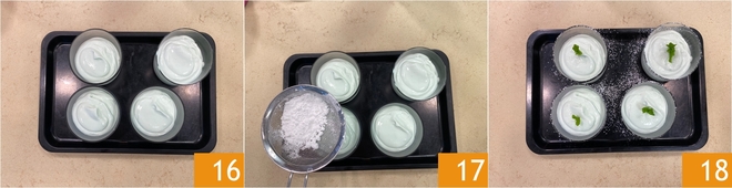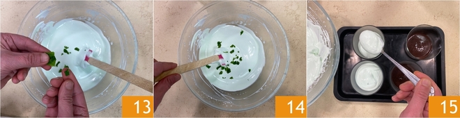 Añadid las hojitas de menta 13 y mezclad otra vez con mucha delicadeza 14. Cuando la base de cacao esté fría, completad los vasitos repartiendo encima la mousse de menta 15.