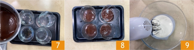 Repartid la mezcla todavía caliente en cuatro vasitos 7 8, luego llevadlos al frigorífico y dejad enfriar durante 15-30 minutos, hasta que la base esté bien cuajada. A continuación montad la nata vegetal bien fría 9.