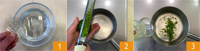 Para preparar la mousse de mojito, lo primero es poner en remojo la gelatina en hojas 1. Mientras tanto, rallad la cáscara de lima en un cazo 2 y verted también el jugo de la lima 3.